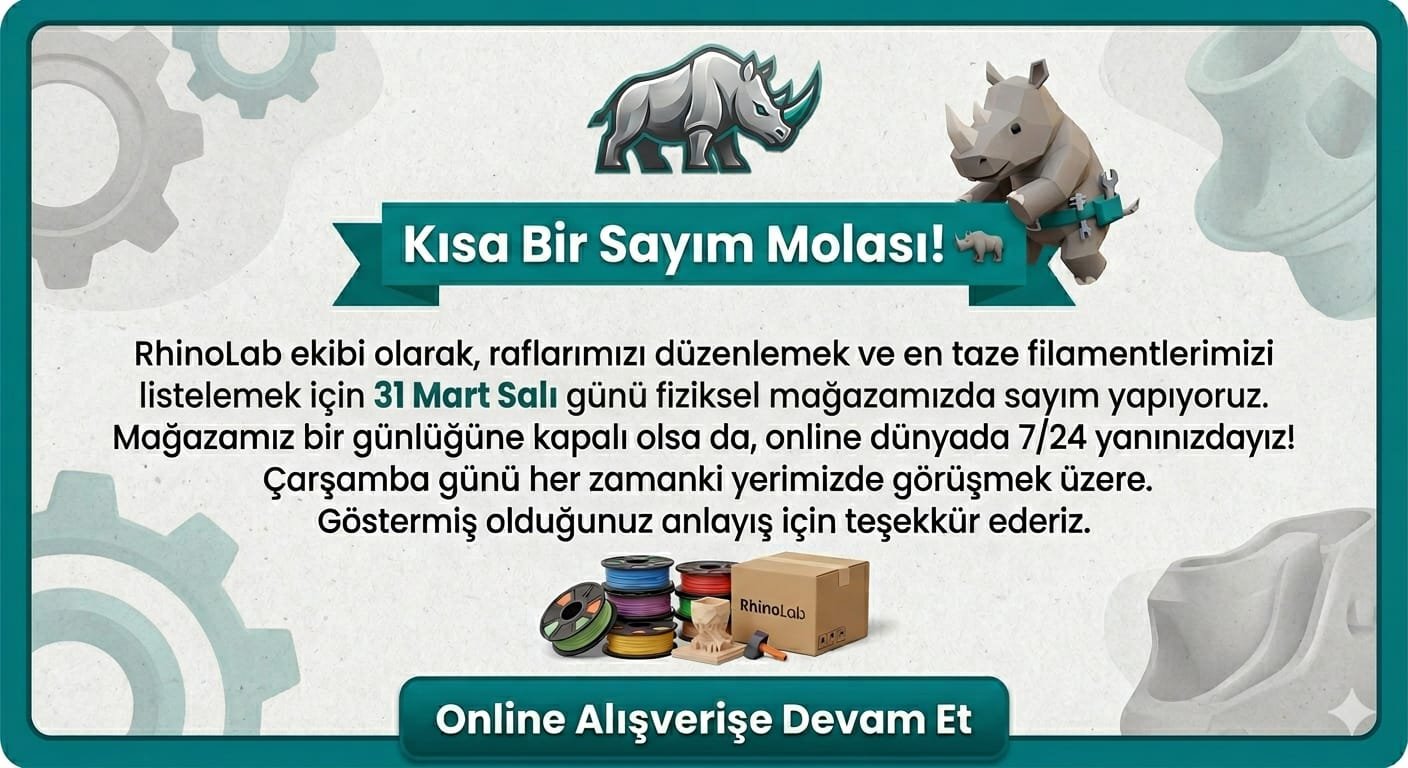 Sektördeki derin tecrübemizi, kendi markamız olan RHINOLAB ile taçlandırıyoruz. RHINOLAB PLA Basic Fast başta olmak üzere, yüksek hızlara (600mm/s+) uyumlu, tolerans hassasiyeti optimize edilmiş filamentlerimizle baskı kalitenizi garanti altına alıyoruz. Üretici olmanın verdiği avantajla, sarf malzemelerinde en yüksek kaliteyi en erişilebilir şartlarda sunuyoruz.