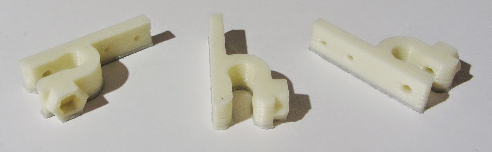 Kitimizdeki hareketle ilgili plastik parçaları genel olarak incelemiş olduk. Birkaç plastik parçamız daha var, şimdi onlara bir göz atalım. Aşağıda yer alan parçalara "endstop holder" adı verilmiş. Bu parçaların üstüne birer adet düğmeye benzer alet monte ediliyor. Bu aletlerin fonksiyonu, yazıcı kafanın konumunun yazıcı tarafından belirlenebilmesini sağlamak. Kafa bir yönde gereğinden fazla yol alırsa bu endstoplara çarpıp mikrokontrol devresine bir sinyal gönderiyor. Bu sayede kafanın başka bir yapıya çarpıp hasar görmesi (veya çevreye hasar vermesi) ihtimali azaltılmış oluyor. Aşağıda bu parçanın resimleri var: