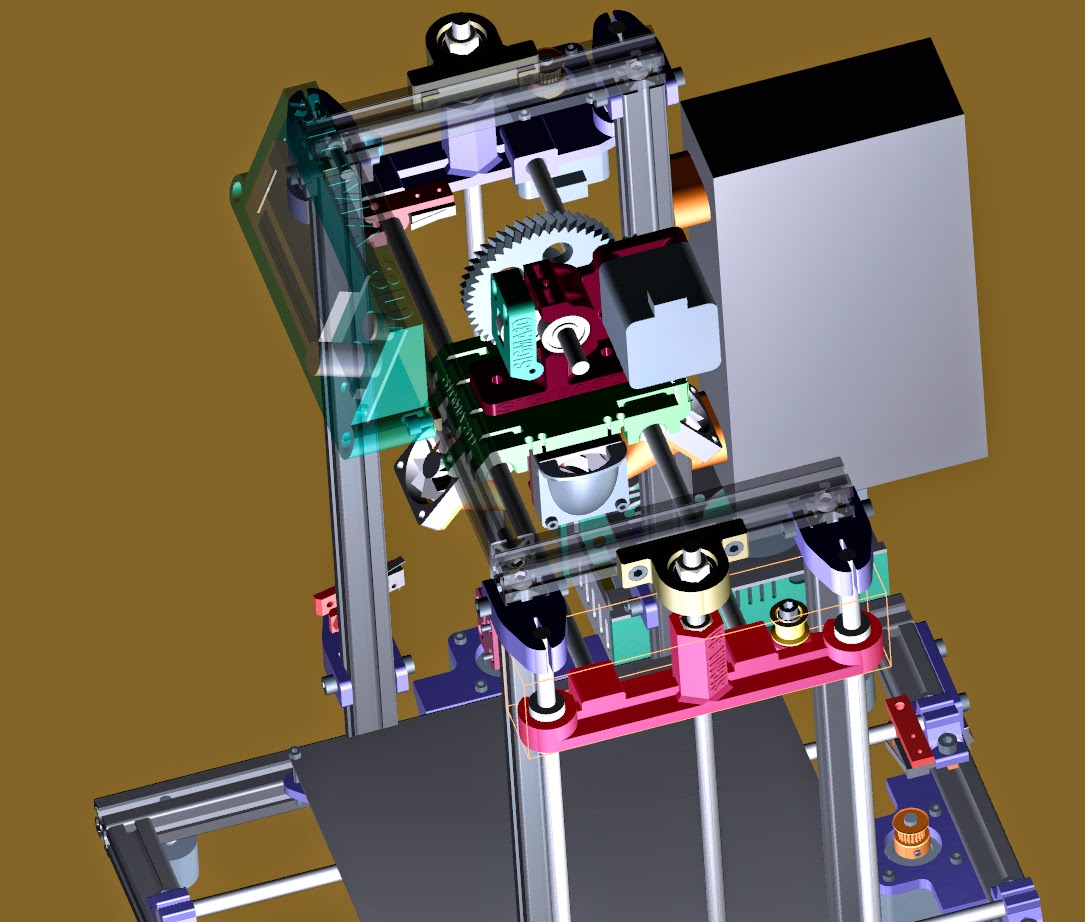 Bu resimde dikkatimizi çeken yapılara bakarsak, her iki yanda en uçta, birer tane, tam kapanmamış olan daire görüyoruz. Bunlar Z aksı yönünde harekete izin verecek olan Z millerinin geçecekleri rulmanların takılacakları boşluklar. Sağdaki dairenin arkasında ortasında çember şeklinde bir açıklık bulunan kare şekilli bir bölüm görüyoruz. İşte bu bölüm X aksını kontrol eden motorun flanşı olarak görev alıyor. Daha ortaya doğru ilerlediğimizde, hem sol hem sağda, resme göre ön tarafları delik olan iki adet kutu görebiliriz. Bu kutulardaki deliklere X aksında harekete izin verecek olan krom miller takılıyor. En ortada gördüğümüz altıgen yapı ise gijon adı verilen ve Z aksını hareket ettiren motorun ucuna takılan dişli bir çubuğun geçtiği delik. Gijon sayesinde motorun dönüş hareketi yukarı-aşağı yönde harekete çevriliyor. Parçanın şemadaki yerine baktığımızda bahsettiğim yapılar daha kolay anlaşılabilir hale gelirler diye düşünüyorum: