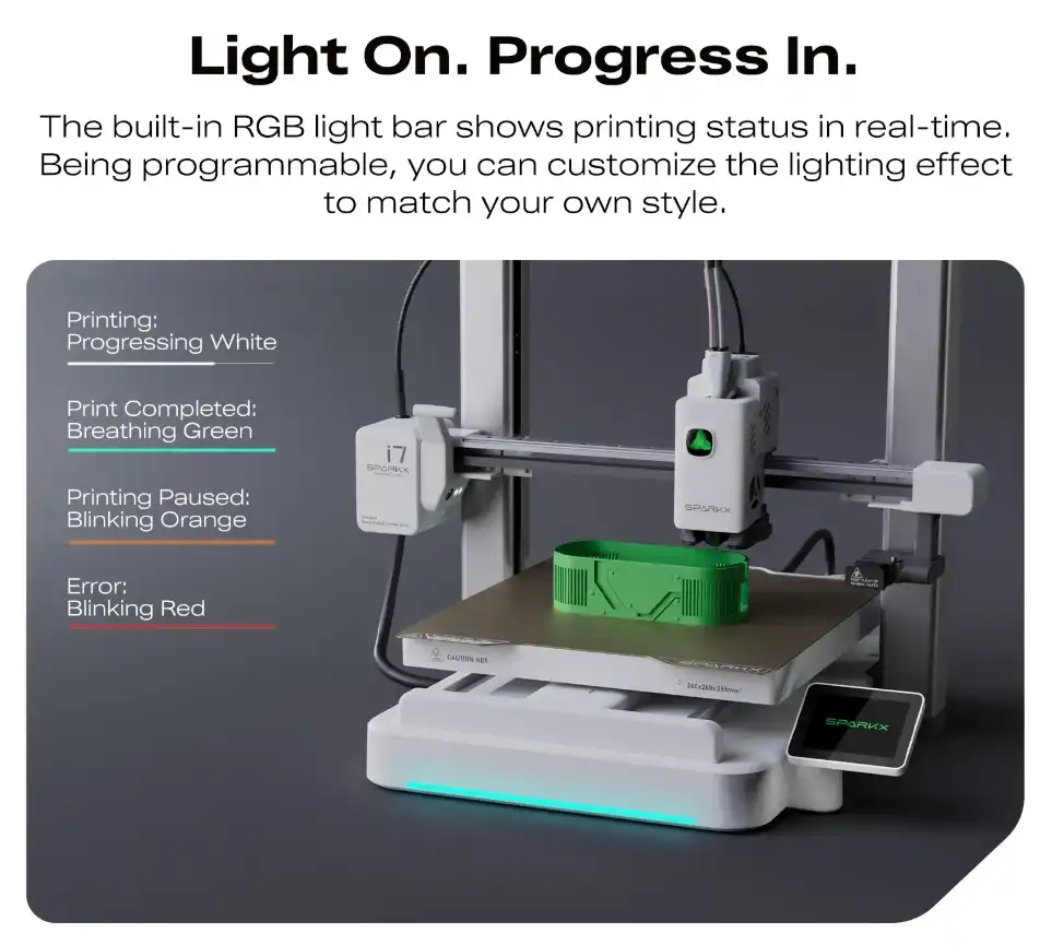 Bilgilendirici RGB Aydınlatma: SparkX i7, baskı durumunu odanın diğer ucundan bile görebilmenizi sağlayan dinamik RGB aydınlatmalara sahiptir. Bu şık ve fonksiyonel tasarım detayı, cihaza fütüristik bir hava katar.