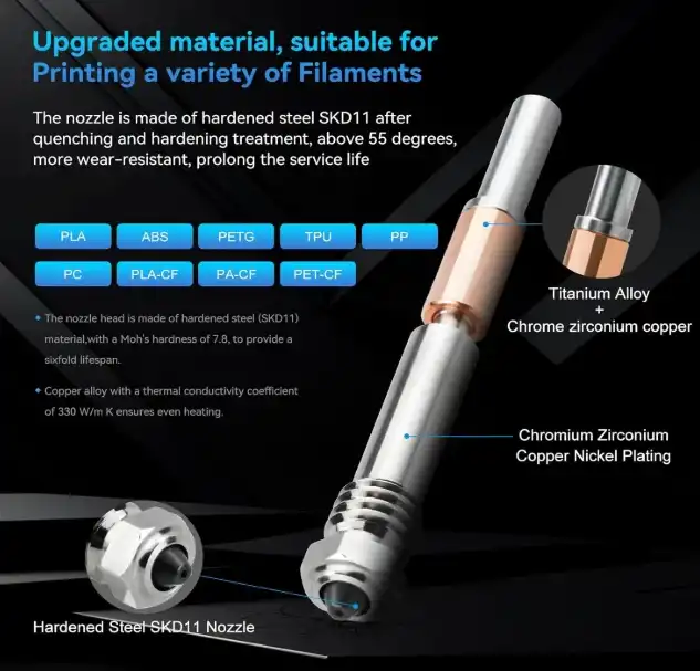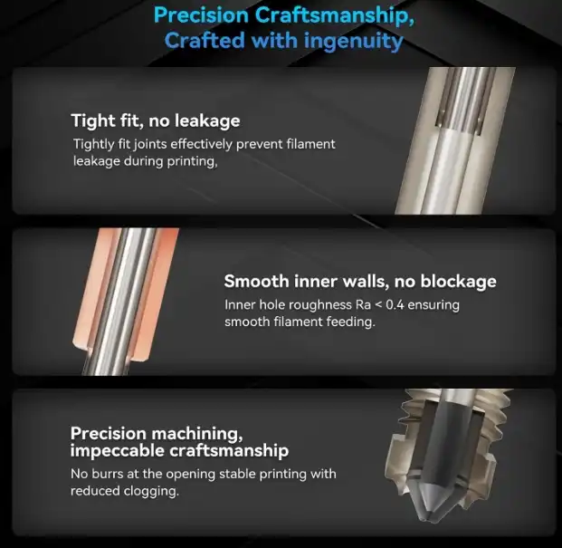 - Pürüzsüz İç Yüzey: Ra0.4 iç duvar pürüzsüzlüğü sayesinde akışkanlığı artırır ve filament tıkanmalarını önler.