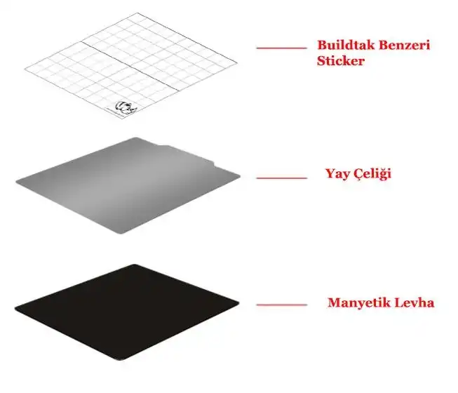 Ürünün kullanımı son derece pratiktir. İlk adımda yazıcınızın alüminyum ısıtıcı tablasına yüksek ısıl dayanıma sahip manyetik levhayı yapıştırın. Ardından yay çeliği levhanın üzerine özel yüzey dokusuna sahip Buildtak benzeri stickerı uygulayın. Manyetik kuvvet sayesinde yay çeliği tabla üzerine sıkıca oturur ve baskı sırasında kayma yapmaz. Özel dokulu yüzey, binlerce baskıda test edilmiş olup ilk katman yapışma sorunlarını minimize eder. Baskı bittikten sonra yay çeliğini manyetik tabandan kaldırıp hafifçe esnetmeniz, modelin tabladan ayrılması için yeterlidir. Bu sayede spatulaya ihtiyaç duymadan, baskı yüzeyine zarar vermeden bir sonraki işleme hızlıca geçebilirsiniz.
