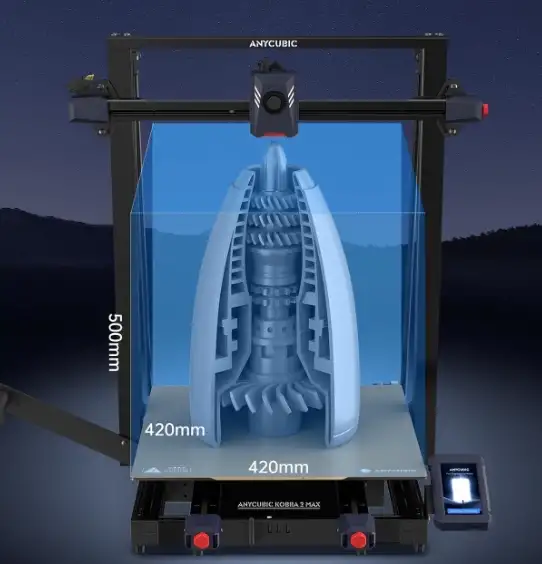 Anycubic Kobra 2 Max ile büyük boyut 420 x 420 x 500 mm masif yapı hacmi ile Anycubic Kobra 2 Max 3D yazıcı modelleri yaklaşık 88 litre baskı ile kreasyonlarınızı bir trende hayata geçirebilirsiniz.