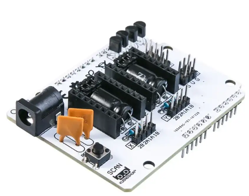 Arduino Scanner Shield Modülü, Arduino UNO kartı ile uyumlu bir güç kalkanıdır. Bu kalkan, A4988 veya DRV8825 Motor Sürücü Modülü, lazer modülleri ve LDR sensörleri kullanan step motorları kontrol etmek için kullanılır.