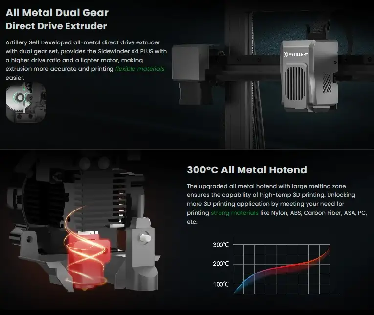 PLA, TPU, PETG, ABS ve naylon dahil olmak üzere yüksek sıcaklıktaki filamentleri işleme kapasitesine sahip, 300°C yüksek sıcaklıkta nozül ve nozül otomatik temizleme.