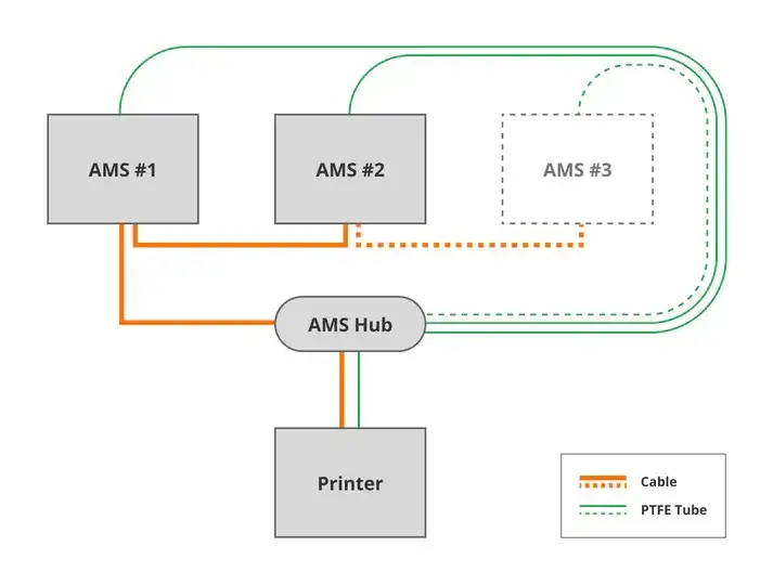 Genel Bakış :AMS Hub, Bambu X1 serisi yazıcılara bağlı AMS sayısını 1'den (4 kanal) maksimum 4'e (16 kanal) çıkarmak için kullanılır. .