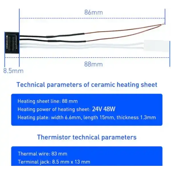 Kablo Uzunluğu: Isıtıcı için 88 mm, termistör için 83 mm