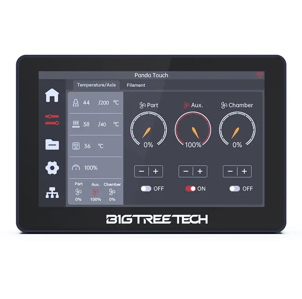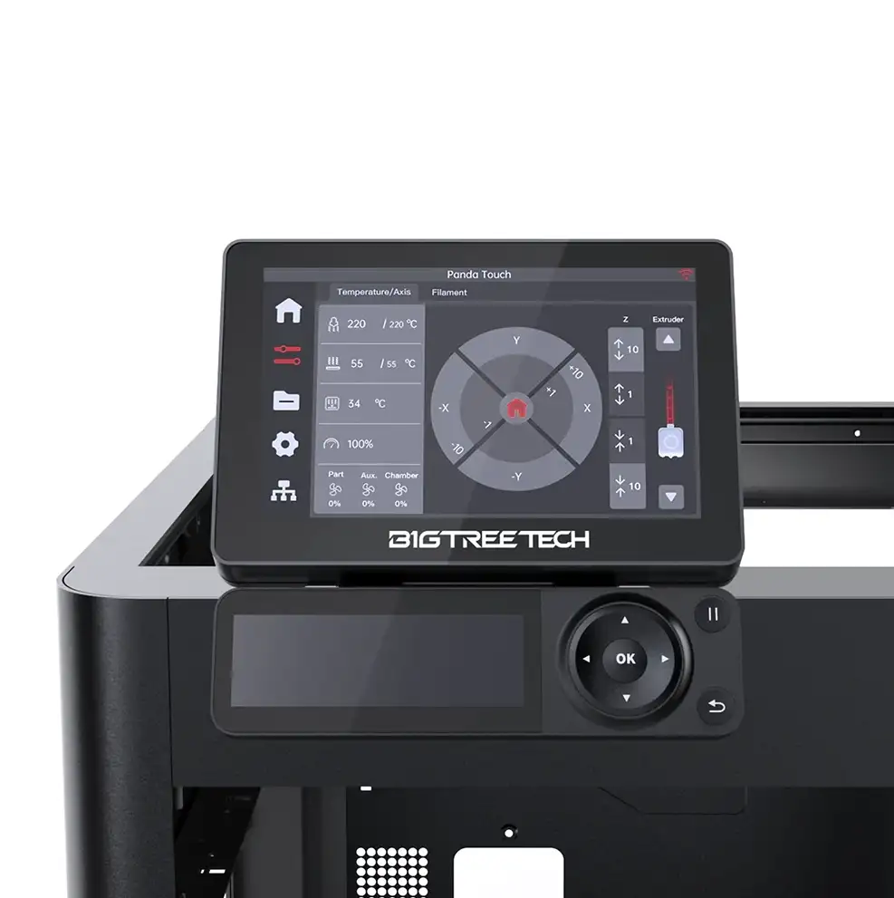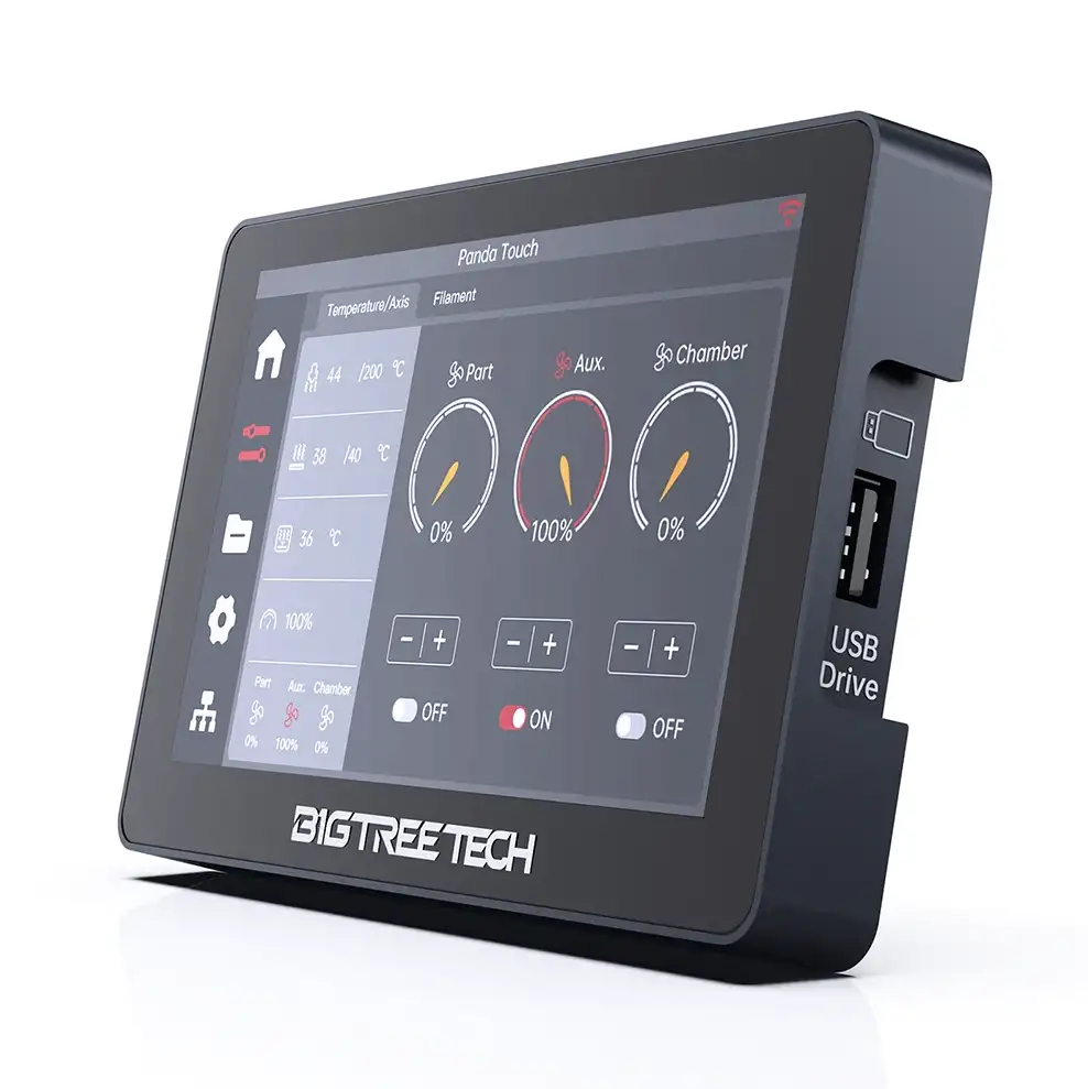 Panda Touch, BIGTREE Technology Co., LTD. tarafından geliştirilen 5'' dokunmatik bir ekrandır, kullanışlı özelliklere sahip güzel bir kullanıcı arayüzü sunar ve Bambu P1P ve Bambu P1S için alternatif veya yedek ekran olarak kullanılabilir. Ayrıca X1 ve A1 serileri ile arayüz oluşturur ve 10 adede kadar Bambu Labs yazıcı için grup baskısını ve kontrolünü destekler.