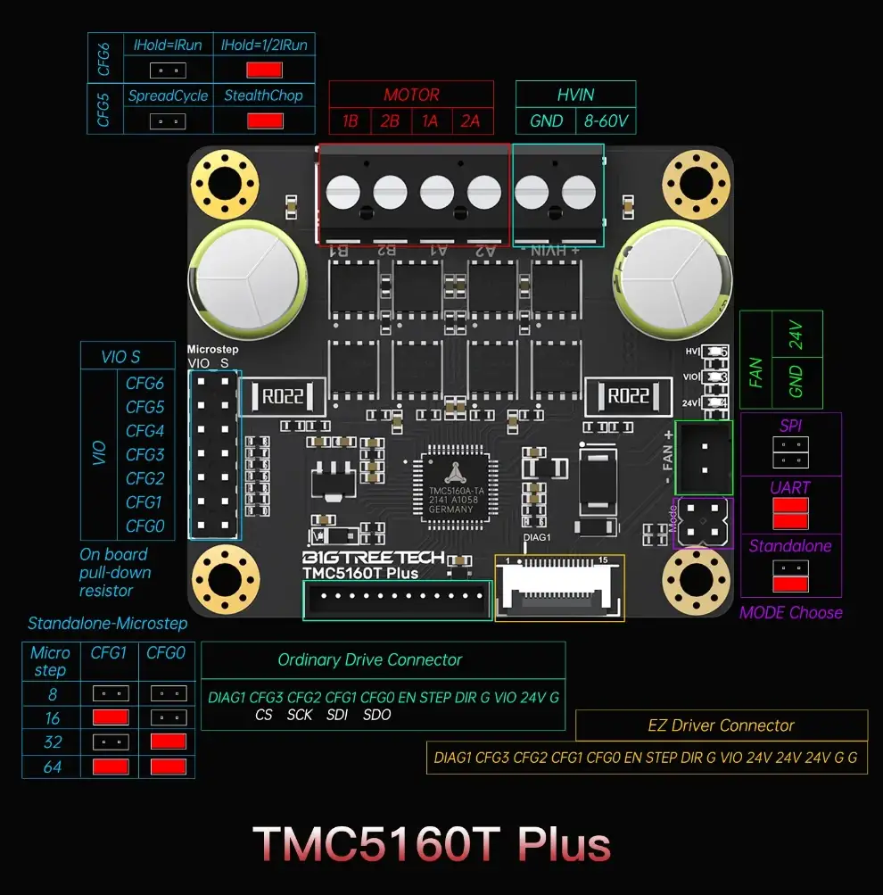TMC5160T Plus, maksimum 60V voltaj ile karta ayrı ayrı monte edilmiş 8 yüksek güçlü MOSFET içeren yüksek güçlü bir step motor sürücü kontrol modülüdür. Bu, daha geniş bir step motor yelpazesini destekler ve daha fazla uyarlanabilirlik sunar.