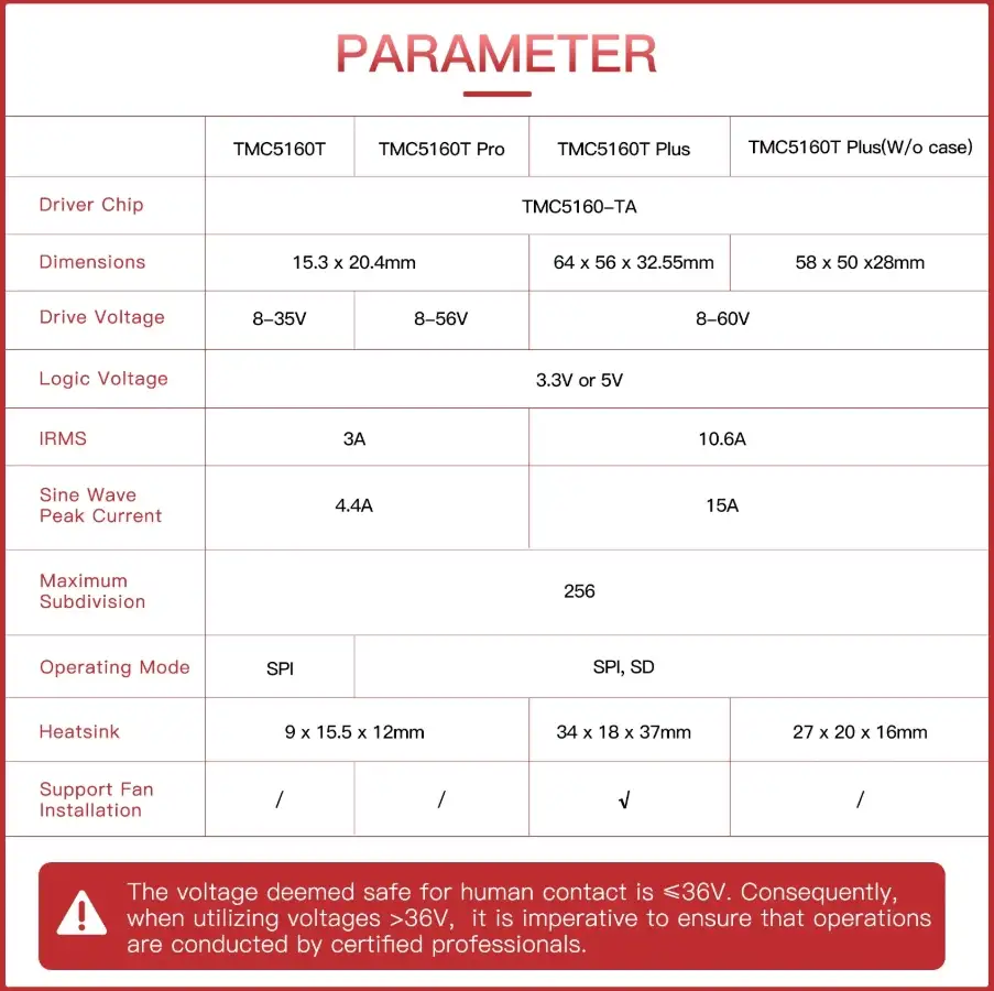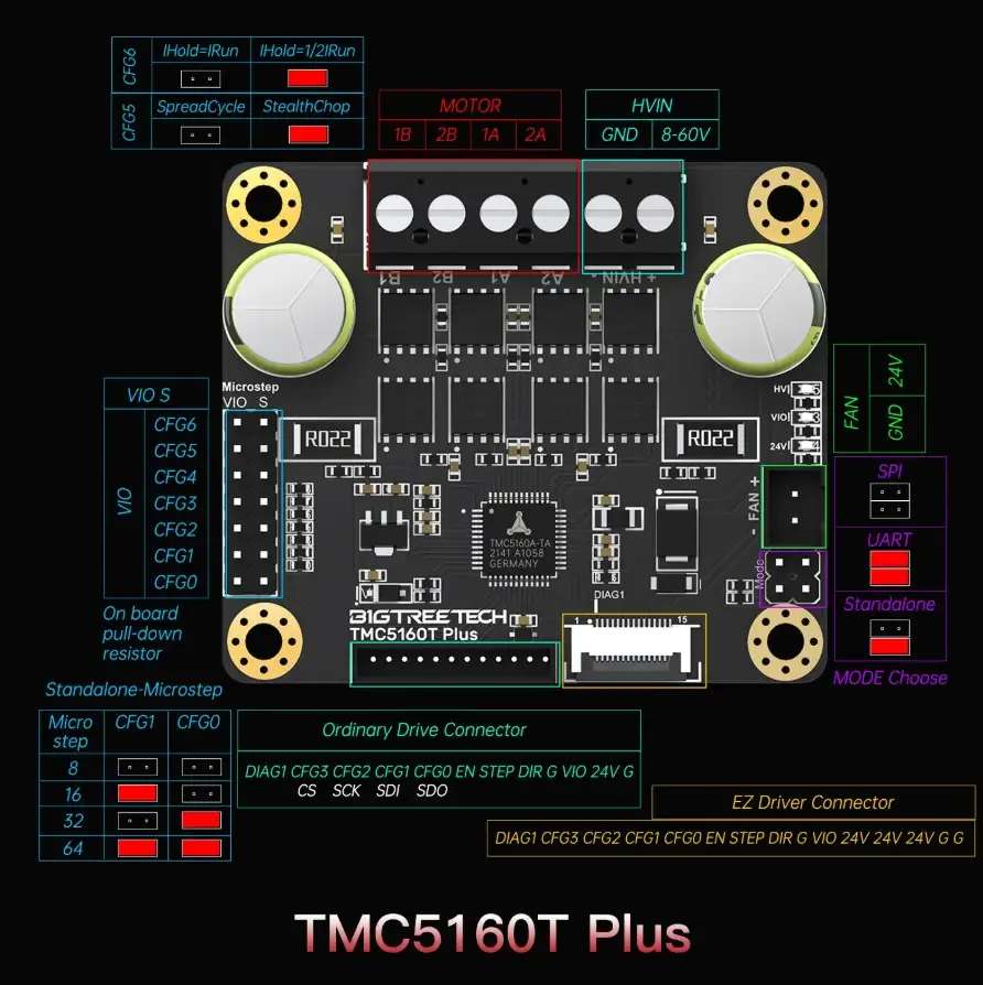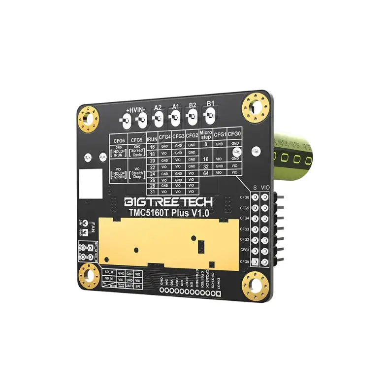 TMC5160T Plus, kart üzerinde ayrı ayrı konumlandırılmış 8 adet yüksek güçlü MOSFET ile donatılmış, maksimum 60V destekleyen yüksek performanslı bir step motor sürücü kontrol modülüdür. Geniş voltaj aralığı sayesinde daha fazla motor tipiyle uyum sağlar ve yüksek adaptasyon kabiliyeti sunar.