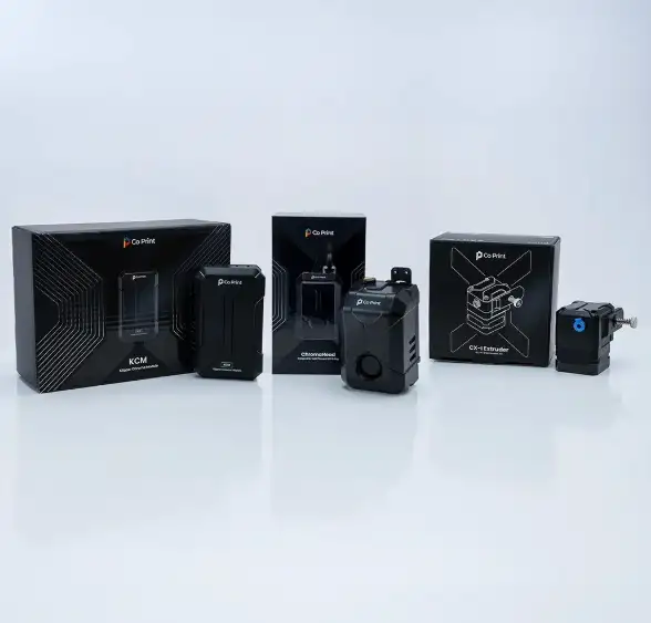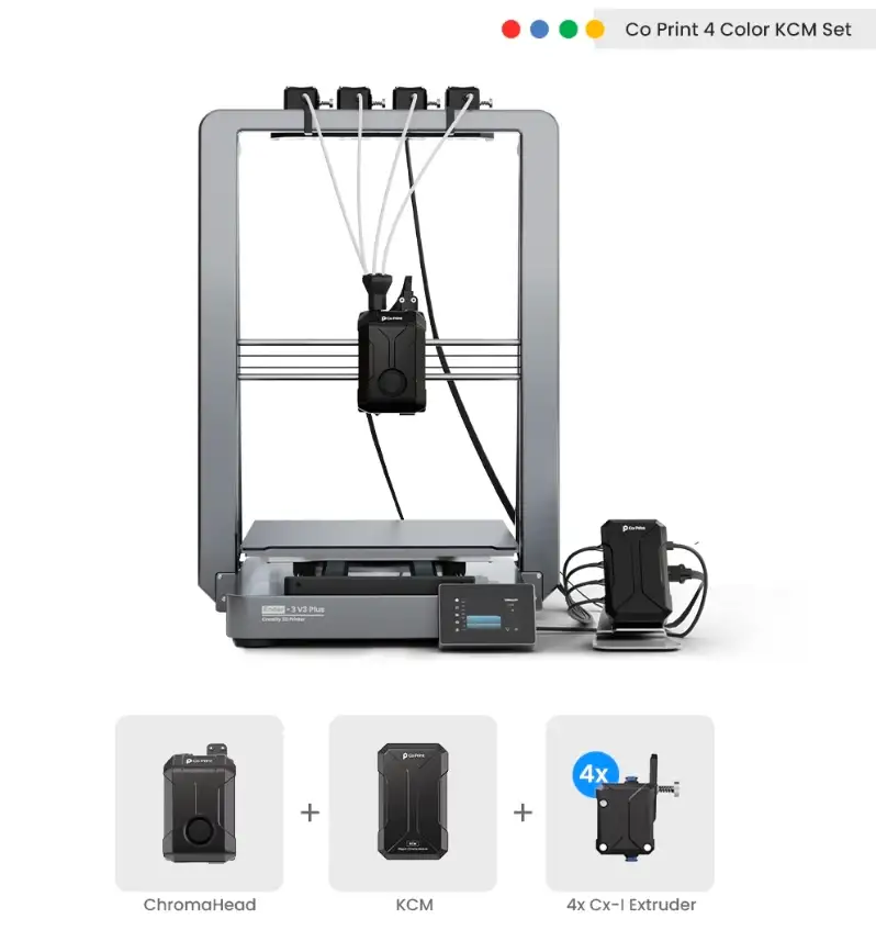 KCM Set, birkaç ana bileşenden oluşur. Sistemin temel parçası olan Chroma Head, içerisinde direct drive extruder, filament kesme modülü ve yüksek akış ile sıcaklık değerlerine sahip bir hotend barındıran bir baskı kafasıdır. Bunun yanı sıra, KCM (Klipper Renk Modülü),4 adet extruder ve ChromaHead’i kontrol edebilen, yazıcıya USB üzerinden bağlanan bir kontrol modülüdür. Set ayrıca, yüksek torka sahip, tam donanımlı bir şekilde sunulan 4 adet CX1 extruder içerir.