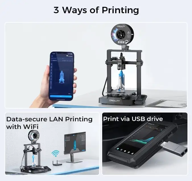 Creality Ender-3 v3 KE da GELENEKSEL BASKI YÖNTEMİ: Otomatik tesviye için CR Touch'ı donatır, baskı platformunda çok noktalı algılama gerçekleştirir ve her algılama noktasının yüksekliğini yüksek hassasiyetle kaydeder. Mükemmel bir ilk katman elde etmek kolaydır. Tesviye baskıdan önce önemli bir süreçtir, genellikle müşterileri belaya sokar. Bu yazıcı tesviye konusunda zaman kazanabilir ve kolayca yazdırmaya başlayabilir. Hangi yeni başlayanlar da dahil olmak üzere tüm müşteriler için dostça. Ender 3 V3 KE, telefon kontrolü, WiFi ve USB sürücü olmak üzere üç yolla yazdırabilir.