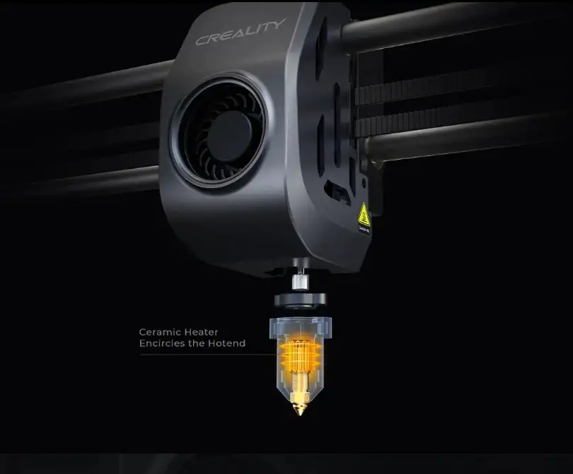 Tüm hotend'i çevreleyen yeni seramik ısıtıcı. 40s'de 200°C'ye kadar ısınır ve filamenti anında eritir.