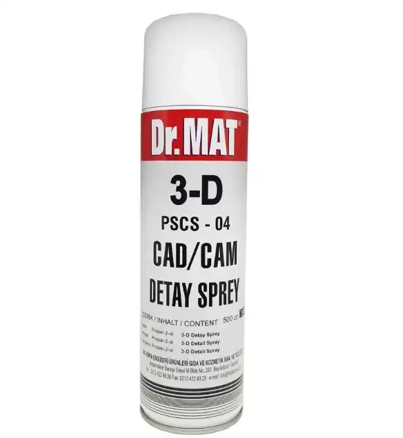 Dr Mat 3D Detay Prof Sprey, 3D tarama işlemlerinde detayları yüksek hassasiyetle yakalamak isteyen kullanıcılar için özel olarak geliştirilmiş profesyonel bir yüzey kaplama spreyidir. Özellikle ince detaylara sahip, parlak ya da yansıtıcı yüzeylerin geçici olarak matlaşmasını sağlayarak, optik ve lazer 3D tarayıcıların yüzeyi daha doğru ve net bir şekilde algılamasına yardımcı olur. 1-2 mikron inceliğinde film oluşturarak parçaların ölçü hassasiyetini bozmaz ve plastik yüzeylerde güvenle kullanılabilir.