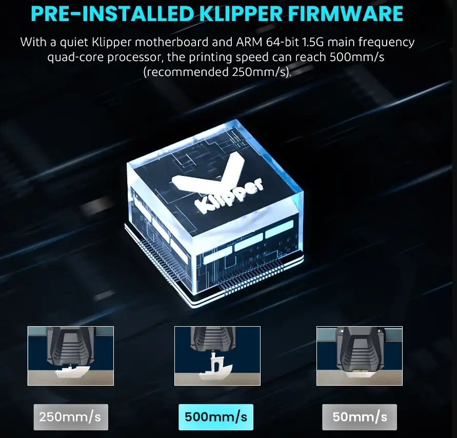 Elegoo Saturn 4 Ultra 12K SLA YazıcıÖnceden Yüklenmiş Klipper Bellenimi: Sessiz bir Klipper anakart ve ARM 64-bit 1.5G ana frekans dört çekirdekli yüksek performanslı işlemci ile ELEGOO Neptune 4, 500 mm/sn'ye (önerilen 250 mm/sn) kadar baskı hızına ulaşabilir; modellerinizi her zamankinden daha hızlı üretmenizi, modellerin baskı kalitesini artırmak için girdi şekillendirmeyi ve basınç ilerleme işlevini destekler. 8G RAM, hızlı depolama ve baskı için 400'den fazla modeli saklayabilir.