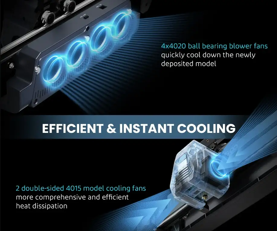 Verimli ve Anında Soğutma: Daha kapsamlı ve verimli ısı dağılımı için kuvvetli rüzgara sahip 2 adet kalınlaştırılmış çift taraflı 4015 model soğutma fanı ve yeni yerleştirilen modeli hızlı bir şekilde soğutmak için baskı kafasının arkasındaki 4x4020 bilyeli fanlar çok yüksek baskı hızlarında bile baskı kalitesi.