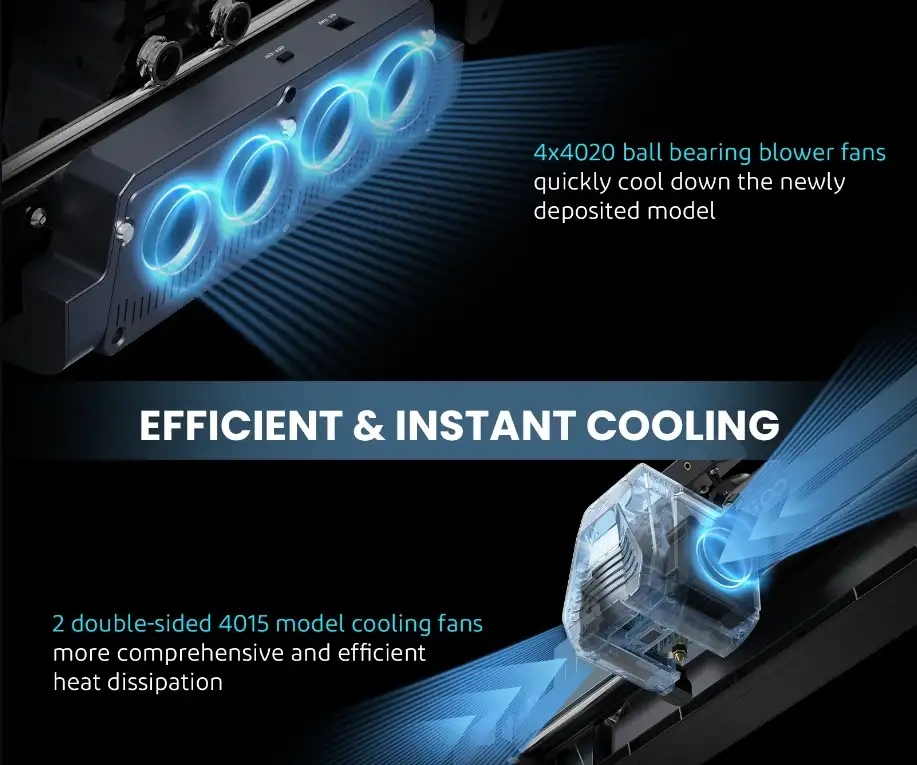 Yeni bırakılan modellerin hızlı ve çok yönlü soğutulmasını sağlamak için Neptune 4 Pro'da, baskı kafasının her iki yanında iki adet kalınlaştırılmış 4015 bilyalı rulmanlı soğutma fanı ve arkasında dört adet 4020 bilyeli üfleyici fan bulunur. Bu soğutma sistemi, yüksek baskı hızlarında bile daha iyi sarkma ve köprü sonuçları için sıcak filamanın hızla bağlanmasına olanak vererek, bükülme veya deformasyon gibi sorunları önler.