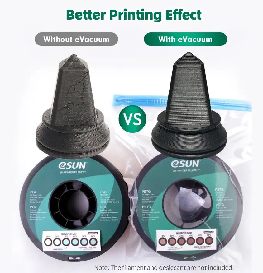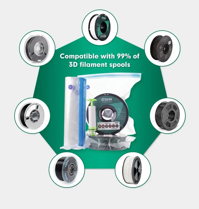 Esun eVakum Kiti, farklı türdeki 3D yazıcı filamentleriyle uyumludur ve her zaman yüksek performanslı sonuçlar sağlar. Esun eVakum Kiti, profesyonel ve hobi amaçlı kullanıcılar için mükemmel bir çözüm sunar, çünkü filamentlerinizi saklamak için güvenli ve etkili bir yol sunar.