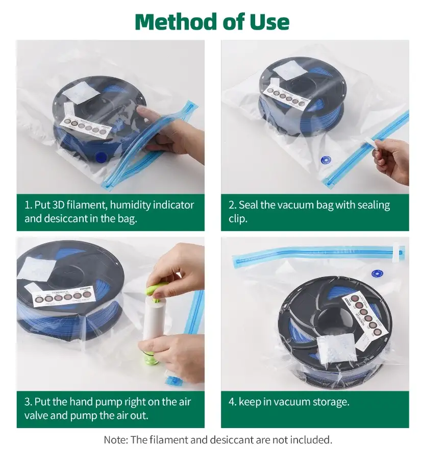 Sarf malzemelerinin, özellikle yüksek su emme özelliğine sahip sarf malzemelerinin vakumla saklanması için portatif bir ev tipi vakum cihazı. Sarf malzemeleriniz açıldığında ve bitmediğinde, malzemenin ıslanmasını ve baskı kalitesini etkilemesini önlemek için malzemelerinizi saklamak için bu kiti kullanabilirsiniz.