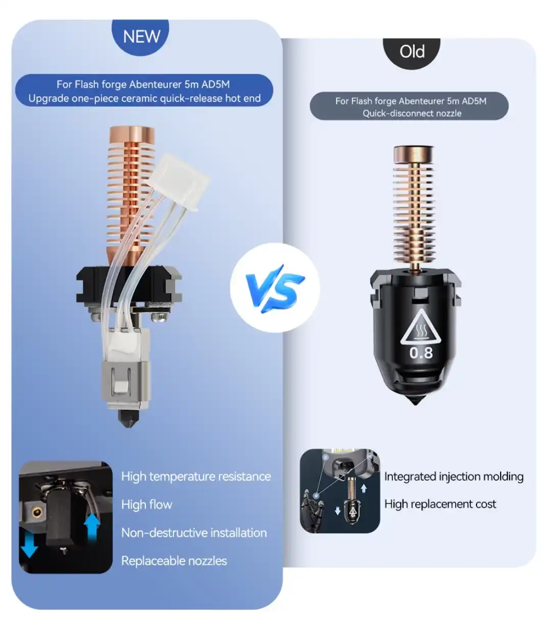 Flashforge Adventurer 5M ve 5M Pro serisi için özel olarak tasarlanmış bu yükseltme hotendi, baskı deneyiminizi bir üst seviyeye taşır. Seramik ısıtıcı fişek teknolojisi sayesinde hedef sıcaklığa saniyeler içinde ulaşarak enerji ve zaman tasarrufu sağlar. Orijinal hotend kiti ile %100 uyumlu mimarisi, herhangi bir modifikasyon gerektirmeden hızlı kurulum imkânı sunar.