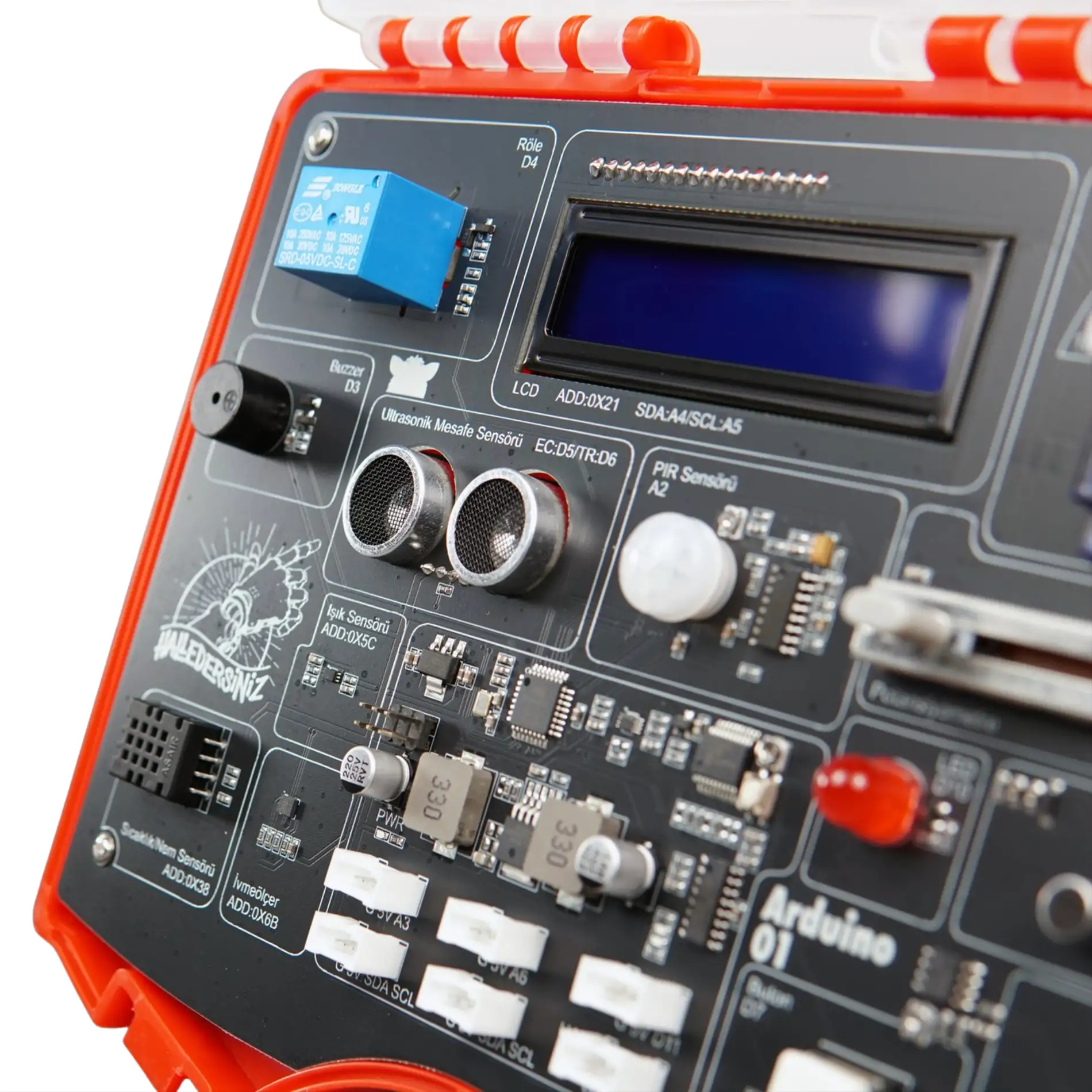Bu kiti diğer setlerden ayıran şey tüm komponentlerin tek bir kart olarak tasarlanmış olması. Böylece hiç bir elektronik bağlantı bilgin olmadan kiti bilgisayarına bağlayıp, dersleri açıp Arduino öğrenmeye başlayabilirsin.