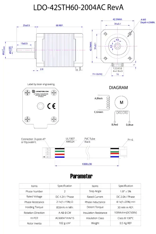 LDO-42STH60-2004AC 1.8 Derece Yüksek Hız Step MotorLDO-42STH60-2004AC, LDO Motors tarafından üretilen yüksek torklu bir NEMA 17 hibrit adım motorudur. Bu motor, 1.8 derece adım açısına ve 60 mm gövde uzunluğuna sahiptir. 2A faz başına akım ile çalışır ve 5.5 kg-cm (76 oz-in) tutma torku sunar. 5 mm çapında bir şaftı vardır. Motor, 1 metre uzunluğunda, 4 pinli JST-XH konnektörüyle sonlandırılmış PVC kablo ile birlikte gelir. Bu özellikleri sayesinde, yüksek performanslı 3D yazıcılar ve diğer hassas hareket kontrol uygulamaları için idealdir.