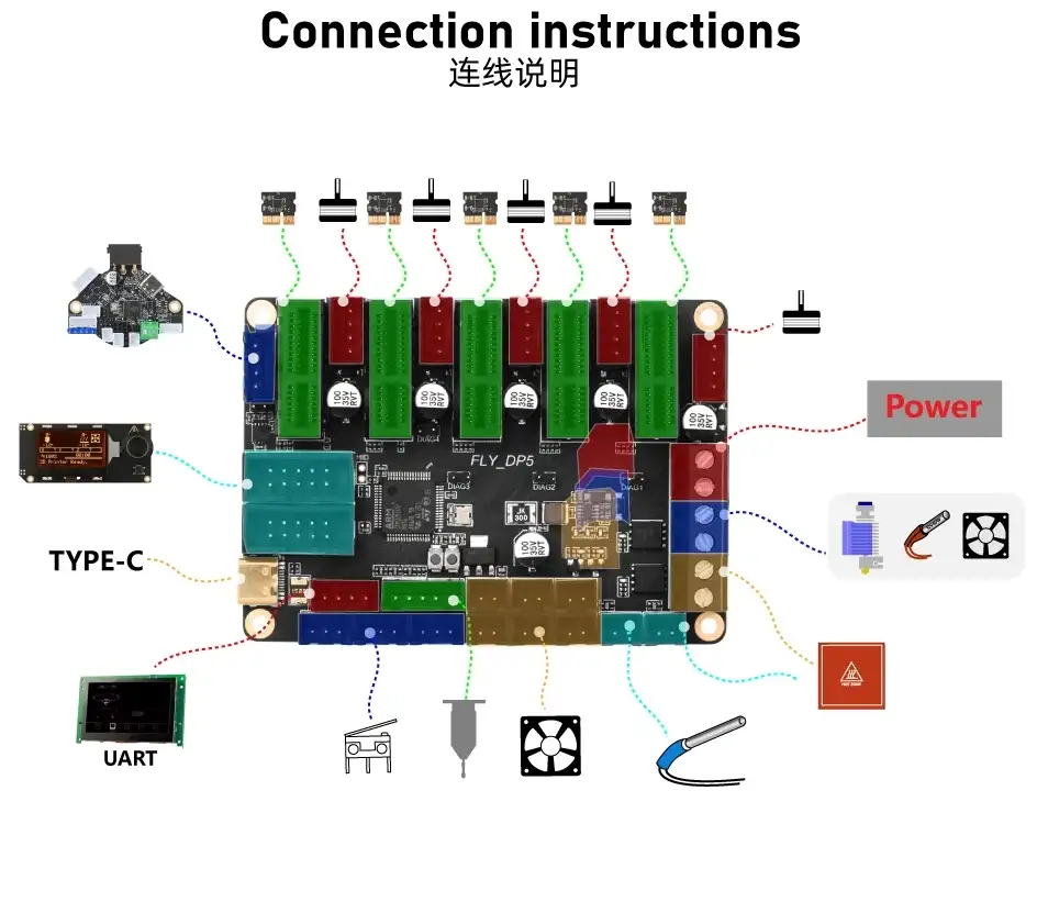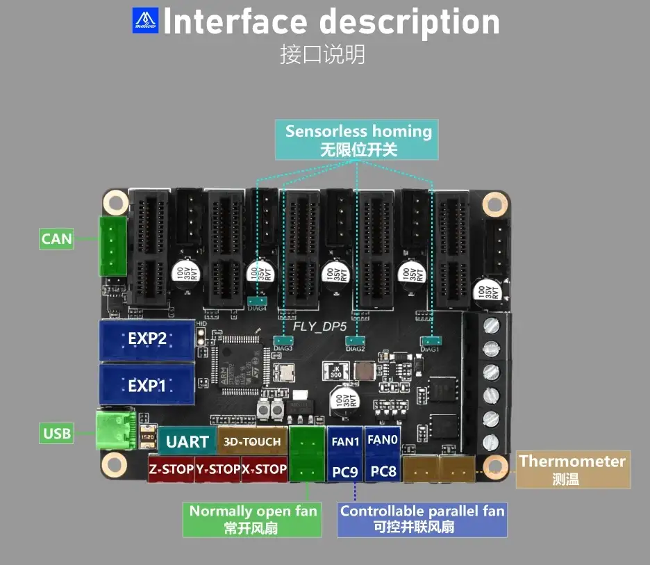 Mellow Fly-DP5 32Bit, 5 Sürücülü 3D Yazıcı AnakartıMellow Fly-DP5, Guangzhou Meilun Electronic Technology tarafından geliştirilen yüksek performanslı bir 3D yazıcı kontrol kartıdır. Beş adet step motor sürücüsünü destekler, geniş yapı uyumluluğu sunar ve hem Klipper hem de Marlin firmware’leriyle tam olarak entegre çalışır.