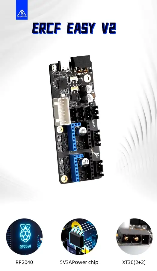 Mellow Fly ERCF Easy V2, 3D yazıcılar için geliştirilmiş, hassas filament yönetimi ve çoklu filament desteği sunan yüksek performanslı bir kontrol kartıdır. ERCF, yani Enraged Rabbit Carrot Feeder sistemiyle uyumlu olan bu kart, filament değişim süreçlerini kolaylaştırarak çok renkli veya çok malzemeli baskıları daha verimli hale getirir.