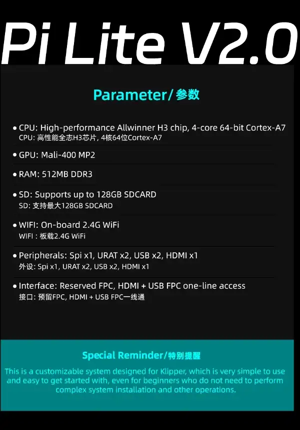 Kompakt tasarımı ve kaliteli bileşenleriyle Fly Pi Lite V2, montaj kolaylığı ve güvenilirlik sunar. Raspberry Pi tabanlı bu kontrol kartı, kolay bağlantı seçenekleri ile çeşitli yazıcı modellerine hızlıca entegre edilebilir. Ayrıca, Fly Pi Lite V2 yüksek hassasiyetli baskılar için gerekli tüm özellikleri sağlar ve baskı sürecinde gelişmiş kontrol imkanı sunar.