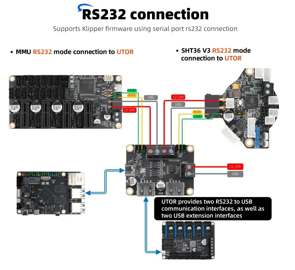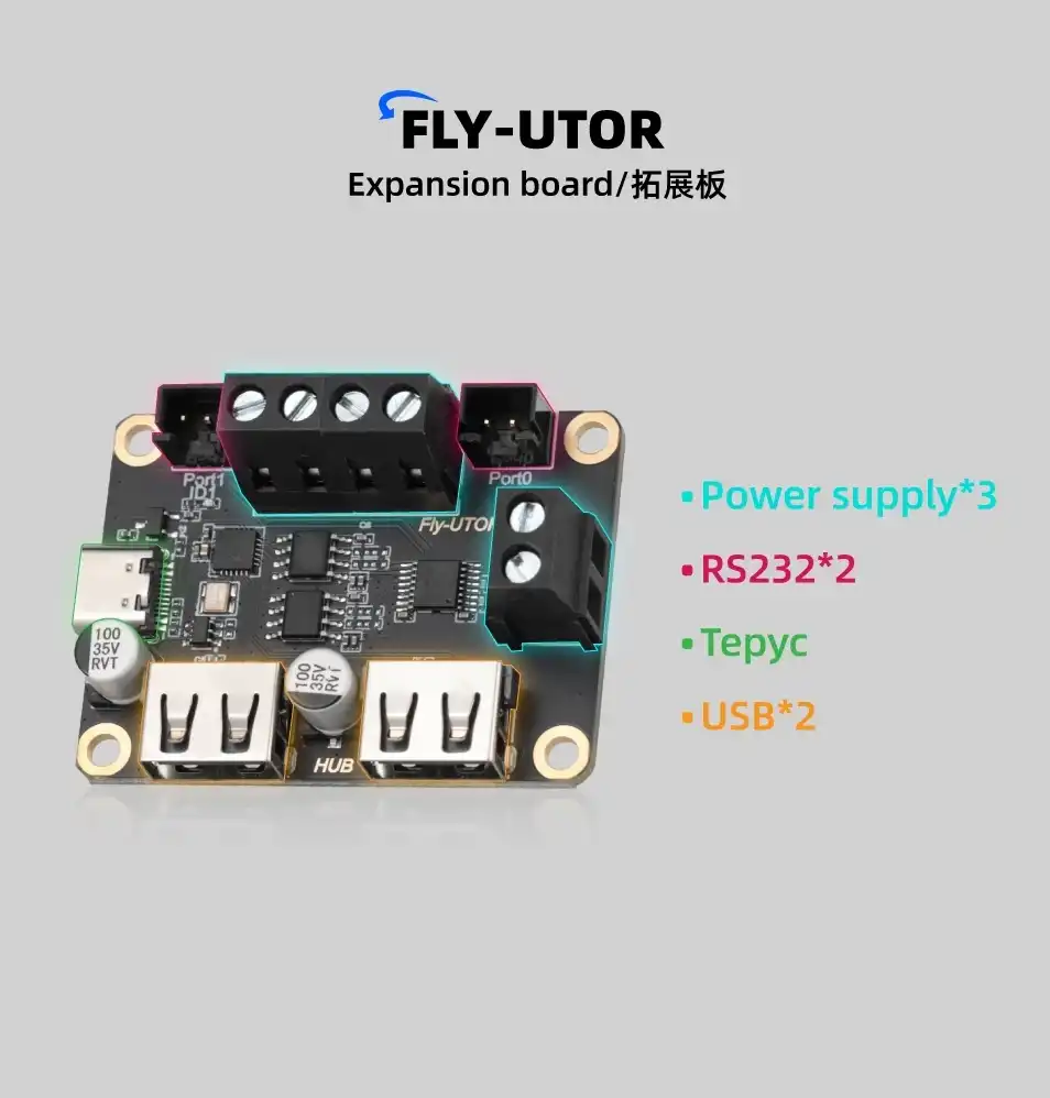 FLY-UTOR, kullanıcılara ek USB portları ve güç genişletme yetenekleri sunarken UART’tan RS232’ye iletişimi destekleyen yüksek performanslı bir arayüz genişletme kartıdır. Kompakt yapısı ve tak-çalıştır özelliği sayesinde, seri haberleşme cihazlarının sisteme entegre edilmesi ve ek güç çıkışlarına ihtiyaç duyulan profesyonel 3D yazıcı projeleri için idealdir.