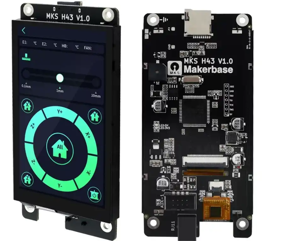 MKS H43, 3D yazıcı deneyiminizi modern bir akıllı telefon seviyesine taşıyan, 800x480 yüksek çözünürlüklü 4.3 inç bir IPS ekrandır. Geleneksel dirençli TFT ekranların aksine kapasitif dokunmatik teknolojisini kullanan bu modül, çok daha hassas ve akıcı bir kontrol arayüzü sunar. IPS panel teknolojisi sayesinde geniş izleme açıları ve canlı renk doğruluğu sağlayarak her yönden net bir görüntü sunar.