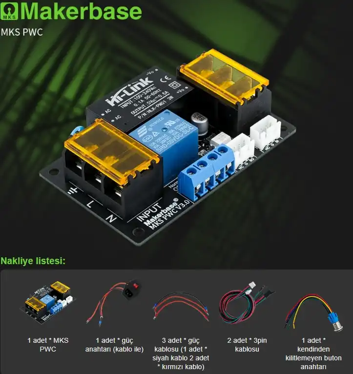 MKS PWC V3.0, 3D yazıcılar için tasarlanmış akıllı bir güç yönetim çözümüdür. Baskı işlemi tamamlandığında veya beklenmedik bir hata durumunda yazıcınızın gücünü otomatik olarak keserek hem enerji tasarrufu sağlar hem de yangın riskini minimize ederek cihaz güvenliğini artırır. Bu modül sayesinde, baskı bittiğinde başında beklemenize gerek kalmadan yazıcınızın elektriği güvenle kapatılır.