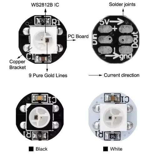 Her piksel LED boncuğu arasında lehimleme yoktur. Eğer birlikte çalıştırmak istiyorsanız, lehimleme işlemini kendiniz yapmanız gerekmektedir.