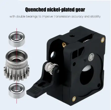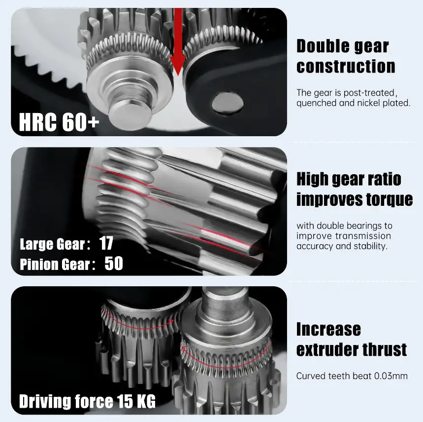 HGT ekstruder dişlisi, entegre sertleştirilmiş ve nikel kaplanmış bir dişlidir. Yeni entegre redüksiyon dişlisi, makine metresinin vidalı sabitlemesini ortadan kaldırarak kayma ve baskı sürecinde gevşeme sorunlarını önler.