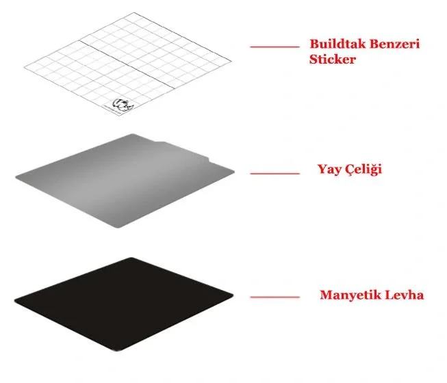 1 Adet Yay Çeliği ,1 Adet Yapışkanlı Manyetik Tabla ve 1 Adet Buildtak Benzeri Stickerımızdan Oluşmaktadır.