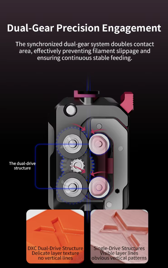 Phaetus DXC Extruder, yüksek hassasiyet ve güçlü filament sürüş performansı sunmak için geliştirilmiş profesyonel bir ekstruder sistemidir. Çift dişli tahrik mekanizması sayesinde filament üzerinde mükemmel tutuş sağlayarak kayma problemlerini ortadan kaldırır ve daha kararlı baskılar elde etmenizi sağlar.
