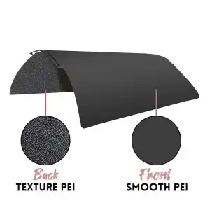 PEY yüzeyinde PLA ve PETG gibi filamentlerle görsel olarak etkileyici ve parlak yüzeyler elde edebilir, levhanın diğer tarafındaki dokulu PEI yüzeyini kullanarak daha teknik ve zorlu projelerinizde maksimum tutunma sağlayabilirsiniz. Çıkartma yerine gerçek toz boyama kullanılması sayesinde ürün uzun ömürlüdür ve her iki tarafı da aktif olarak kullanılabilir.