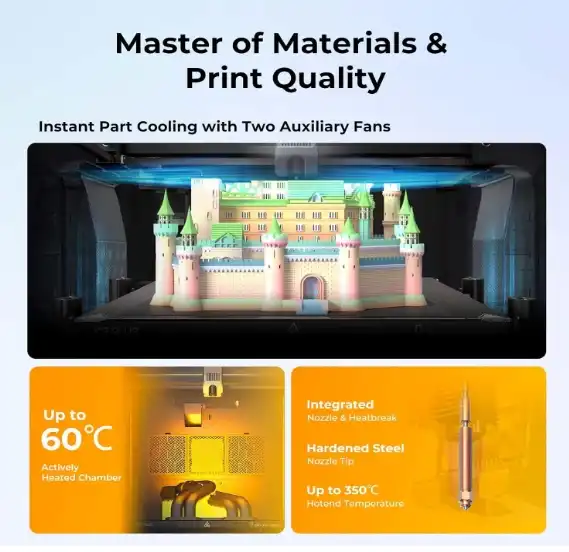 • Aktif Isıtmalı Oda: 60°C'ye kadar aktif olarak ısıtılan baskı odası, ABS ve ASA gibi filamentlerde çekme ve çatlamayı engelleyerek mükemmel yüzey kalitesi sunar.