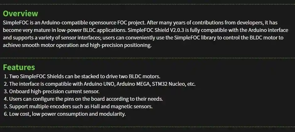 Yenilikçi modüler mimarisi ile çok çeşitli sensör ve motor tiplerini destekleyen shield hızlı montaj ve kolay yapılandırma avantajlarıyla projelerinize hız kazandırır. Arduino IDE üzerinden doğrudan erişilebilen kapsamlı kütüphane desteği farklı mikrodenetleyici ve konum sensörü kombinasyonlarını saniyeler içinde senkronize etmenizi sağlar. Isı yönetimi ve elektriksel verimlilik açısından optimize edilen devre tasarımı özellikle robotik kollar haptik cihazlar ve hassas otomasyon sistemlerinde ihtiyaç duyulan kararlı performansı vadeder. GitHub üzerinde yer alan tam şematik ve yazılım belgeleriyle şeffaf bir kullanım sunan bu donanım motor kontrol projelerinizde yüksek çözünürlüklü çıktı ve endüstriyel güvenilirlik elde etmeniz için tasarlanmış profesyonel bir arabirimdir.
