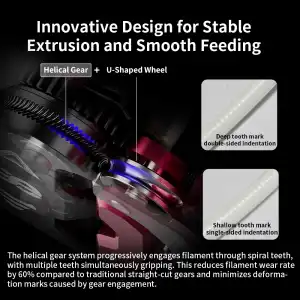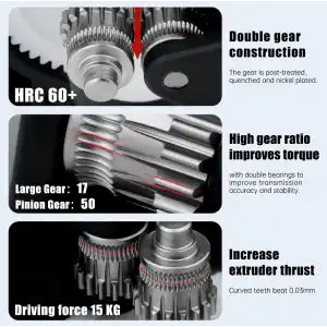 Sertleştirilmiş çelik doğrudan ekstrüder, daha fazla ekstrüzyon kuvveti sağlayan, kaymayı önleyen ve aşınma direncini artıran sertleştirilmiş çelikten yapılmış çift dişli ile donatılmıştır. Bu dişliler, ekstrüder ünitesinin karbon fiber naylon ve cam fiber naylon gibi zorlu mühendislik filamentlerini işlemesini sağlar.