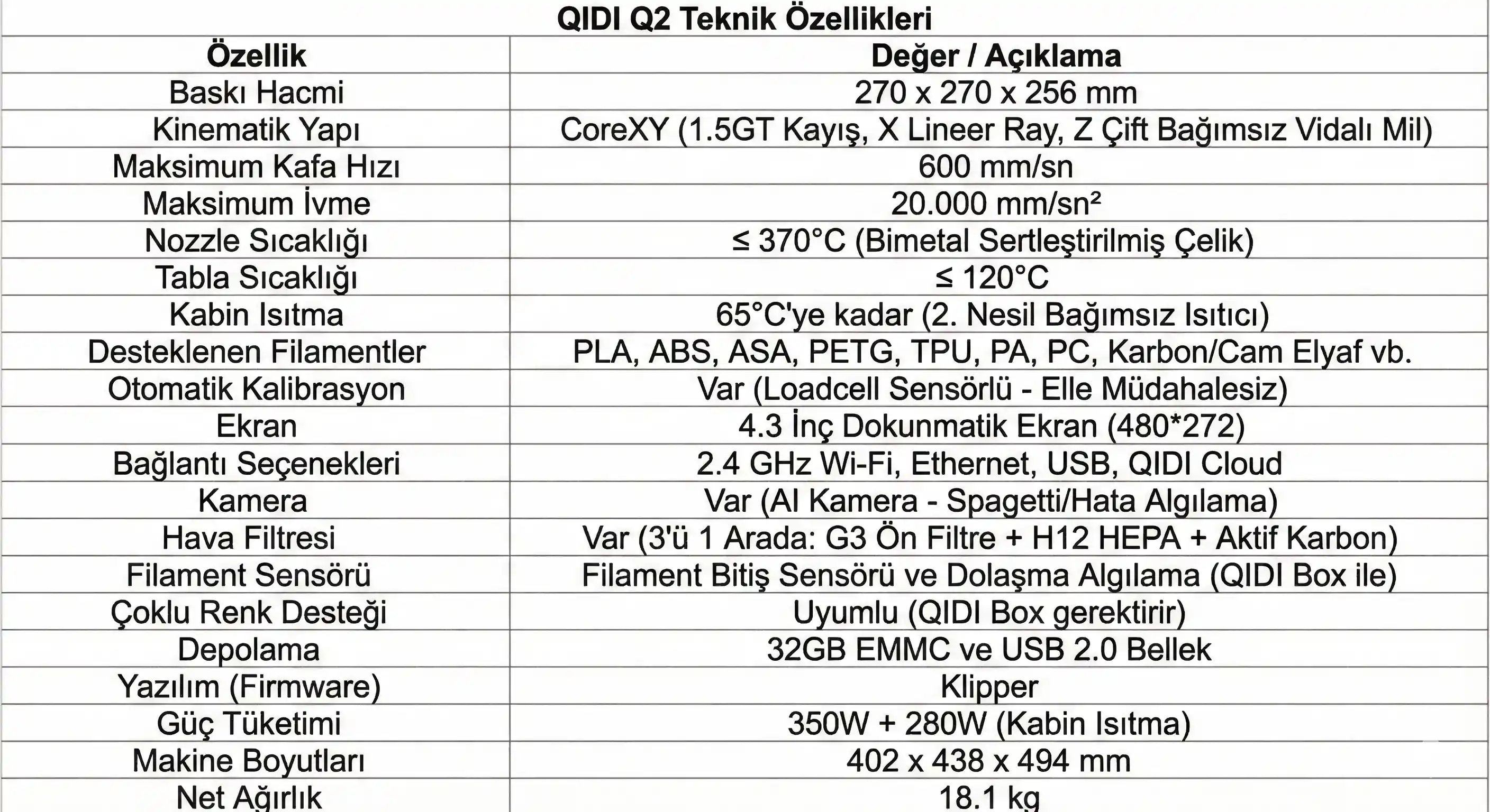 QIDI Tech Q2, hem yeni başlayanlar hem de endüstriyel kullanıcılar için tasarlanmış, yüksek hızlı ve stabil bir CoreXY 3D yazıcıdır. 370°C nozzle sıcaklığı, 65°C aktif ısıtmalı kapalı haznesi ve lineer raylı eksen sistemiyle, standart filamentlerin yanı sıra mühendislik polimerlerinde de kusursuz performans sergiler. 600 mm/s baskı hızıyla yaratıcılığınızı zamandan tasarruf ederek gerçeğe dönüştürür.